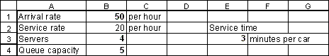 The information above did not provide a service rate directly. Instead, we were told that the average time that a customer (a car) ties up a server (a pump) is 3 minutes. This is the service time per customer, not the service rate (a rate is a quantity per unit time). Enter the service time in cell E3 as shown.