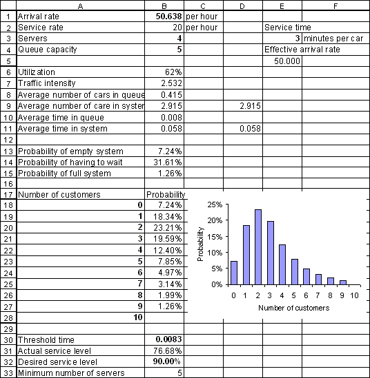 Enter "0.90" in cell B32 and enter "=QTPMMS_MinAgents(B30, B32, B1, B2, 9)" in cell B33. The QTPMMS_MinAgents function should return 5. You can enter 5 in cell B3 and 4 in cell B4 to verify that if the number of pumps is increased by one and the queue capacity decreased by one, the service level rises from 76.68% to 91.80%, meeting the 90% objective.