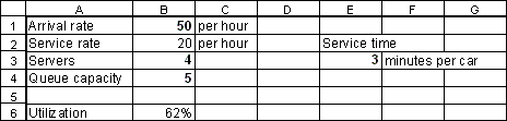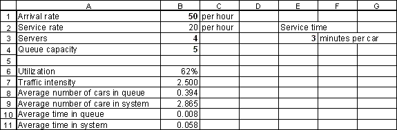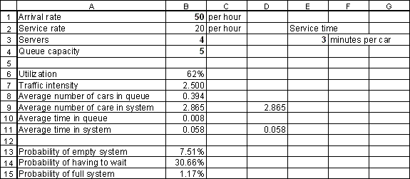 In cell D9, enter the formula "=B3*B6+B8" or in words, the "the number of servers times the average server utilization plus the average number of cars in queue." This quantity should exactly equal the average number of cars in the system (cell B9).
