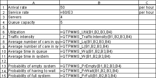 The cell references B1, B2, B3, and B4 are the arguments to theQTPMMS_Util function. They are, in order, the arrival rate, the service rate, the number of servers, and the queue capacity.