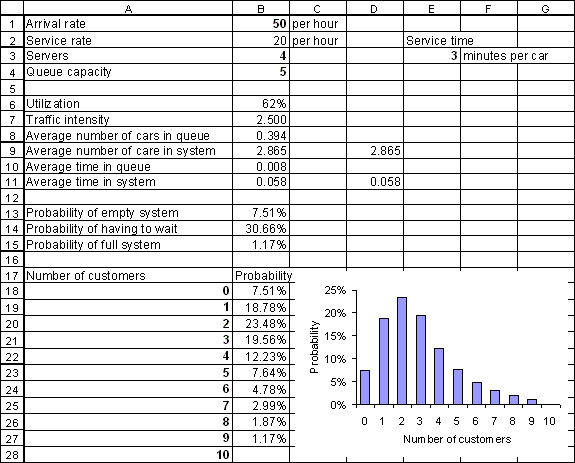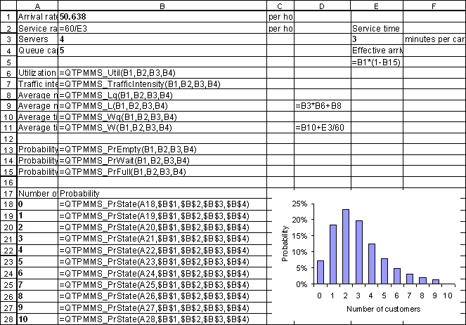 The QTPMMS_PrState function may help you gain a better understanding of the above three probabilities. The state of a queueing system (at least for so-called Markovian queueing systems) is the number of customers in the system. There can be at most 9 customers in the system we are analyzing (4 cars at the pumps and 5 cars waiting). Enter the numbers 0, 1, 2, ..., 10 in the range A18:A28. Then enter the formula "=QTPMMS_PrState(A18, $B$1, $B$2, $B$3, $B$4)" in cell B17 and copy this formula to the range B19:B28. This will calculate the probability that an observer arriving at a random instant sees 0, 1, 2, ..., 10 customers in the system. Format the probabilities as percentages and use the chart wizard to plot them, for example using a column chart. Your spreadsheet should then look something like this: