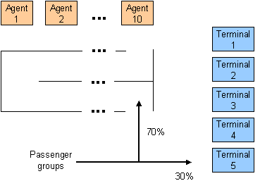 The check-in area has ten check-in counters and five automated check-in terminals, as shown in the picture above. During the busiest part of the day, agents staff all ten check-in counters and an average of 480 passenger groups arrive per hour. (A passenger group consists of people that check in together. A group could consist of one person.) Seventy percent of the groups line up to be served by an agent and the other thirty percent use the automated check-in terminals. For simplicity, we assume that passenger groups decide how they are going to check in (at a counter or using a terminal) before they come to the airport.